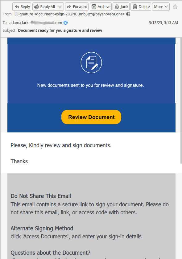 - Convincing subject line: “Please review and sign this document.”